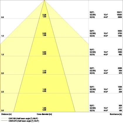 De gradenbundel geeft informatie over hoe breed het licht wordt uitgestraald. Dit zit tussen de 0 en 360 graden (D). Hoe kleiner de hoek, hoe specifieker de lichtbundel is. Over het algemeen is een smalle gradenbundel perfect voor sfeer- of accentverlichting, terwijl een brede gradenbundel ideaal is om grote oppervlaktes te verlichten.
